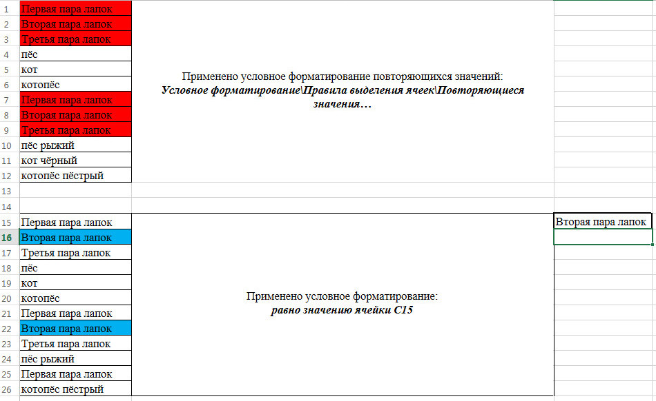 записи я ищу по столбцу А, так как только они меня интересуют. При использовании Условного форматирования выделение повторяющихся записей также происходит только в столбце А. А мне нужно, чтобы чтобы выделились полностью две (и более) строки, значения которых