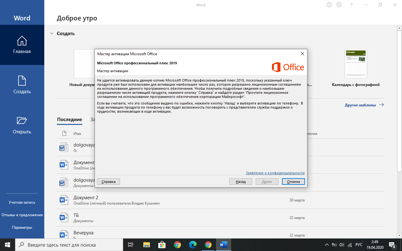 НЕ АКТИВИРОВАН. Установил Office используя ключ он его принял и установил Office. А после перезагрузки потребовал активировать Office. Однако тот же ключ не принимает и говорит что превышено количество активаций данным ключом.