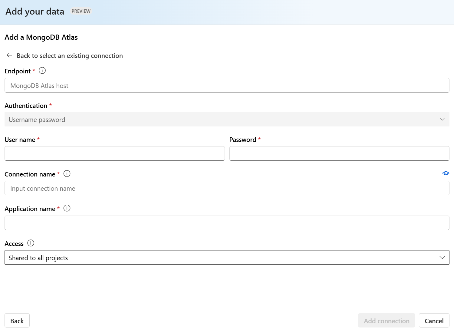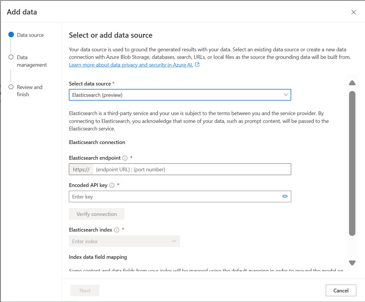 Для отправки данных необходимо подключиться к источнику данных. Если вы хотите использовать данные для чата с моделью Azure OpenAI, данные блокируются в индексе поиска, чтобы соответствующие данные можно было найти на основе запросов пользователей.