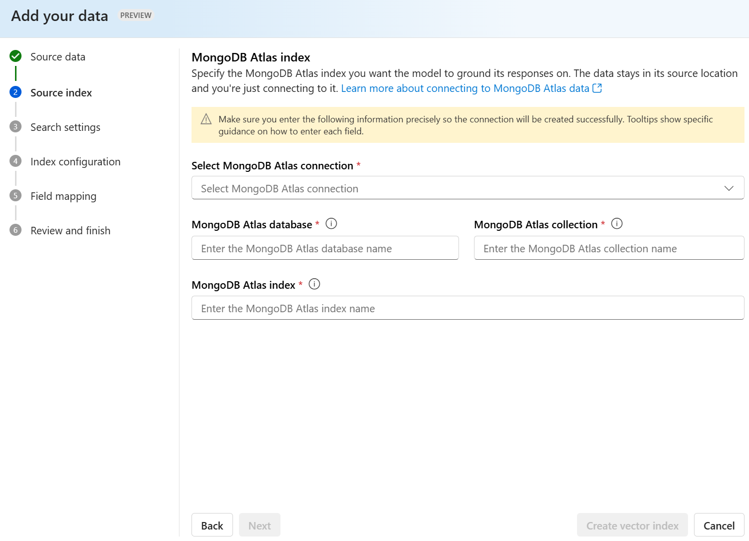 Если вы используете собственный индекс, вам будет предложено на портале Foundry определить поля, которые необходимо сопоставить с ответами на вопросы при добавлении источника данных. Можно указать несколько полей для данных содержимого и включать все поля, имеющие текст, относящиеся к вашему варианту использования.