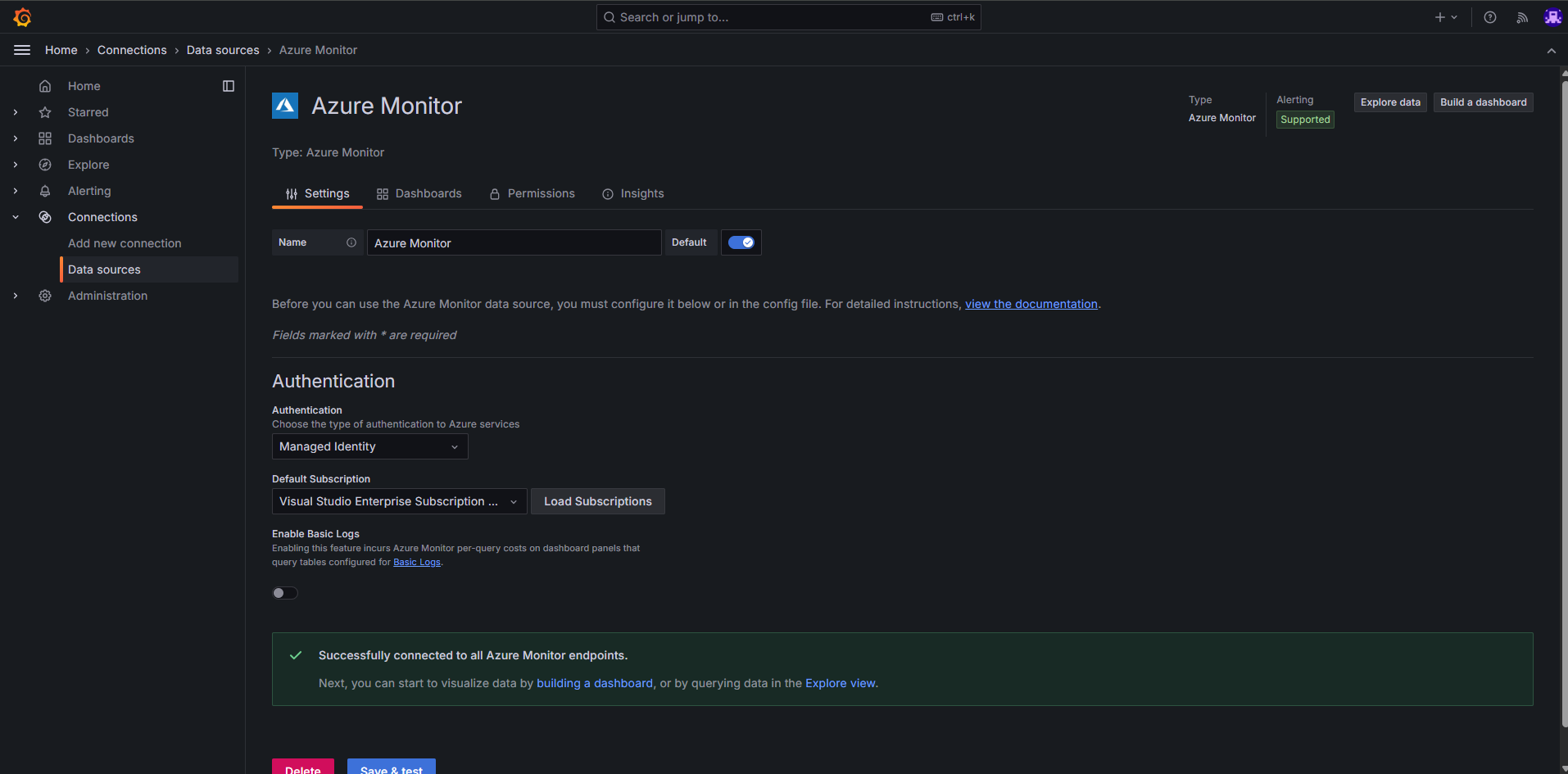 Проверьте источник данных для управляемого экземпляра Grafana. Чтобы проверить подписку на источник данных для панелей мониторинга Grafana, перейдите на вкладку "Источник данных" в экземпляре Управляемой Grafana: