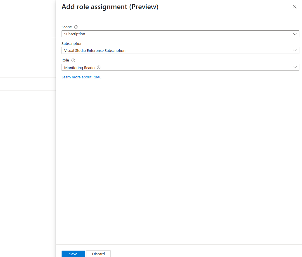 Для области введите подписку. Выберите подписку. Установите роль на Читатель мониторинга, затем выберите Сохранить.