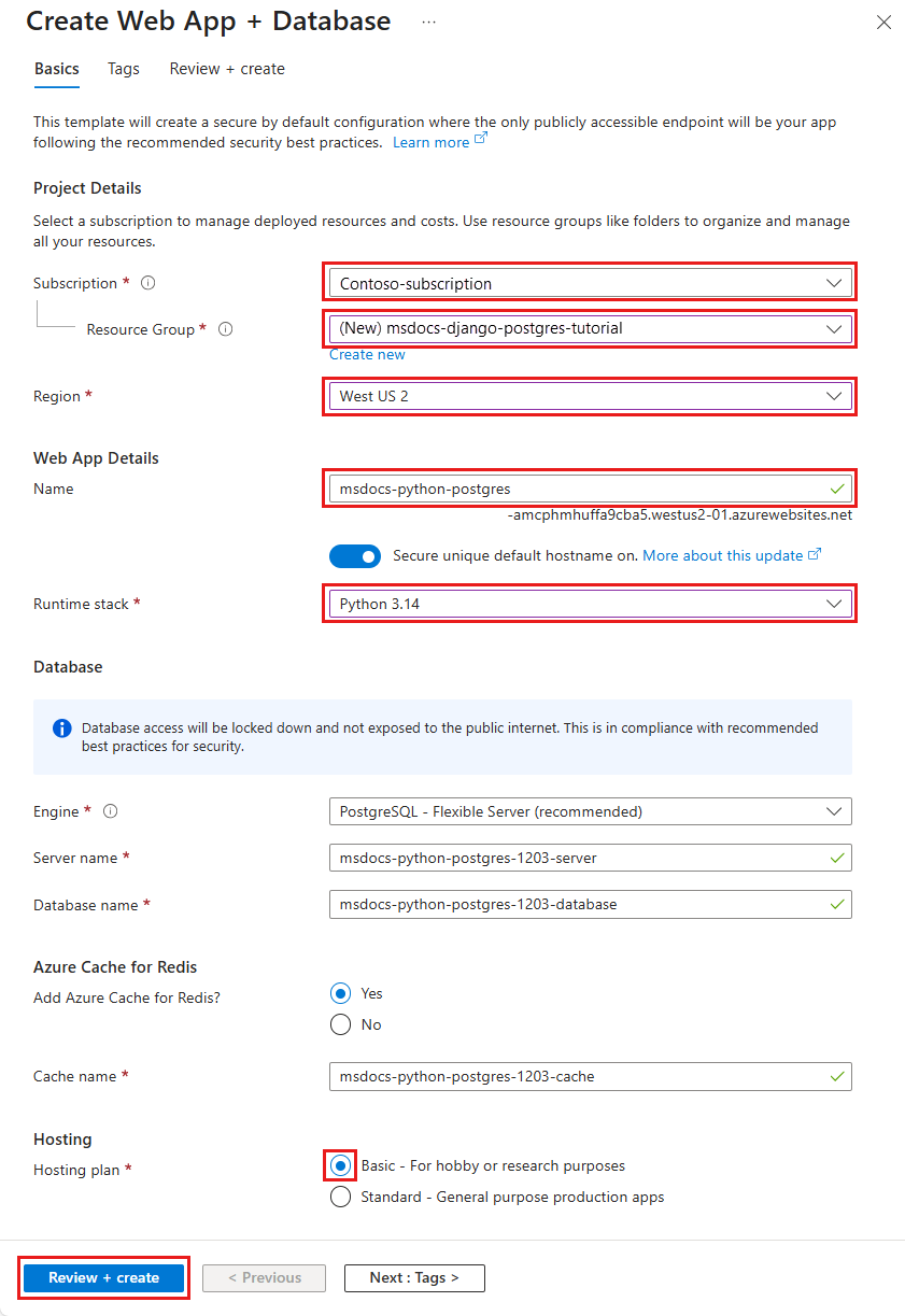 На этом шаге создайте ресурсы Azure. В этом руководстве создается набор безопасных ресурсов по умолчанию, включая службу приложений, базу данных Azure для PostgreSQL и кэш Azure. Для процесса создания вы указываете: