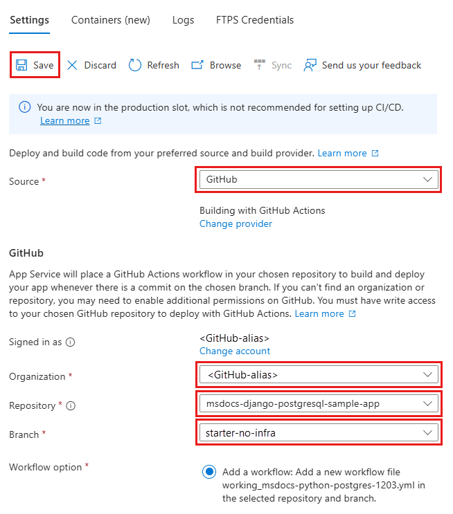 См. статью "Настройка развертывания GitHub Actions" из Центра развертывания.