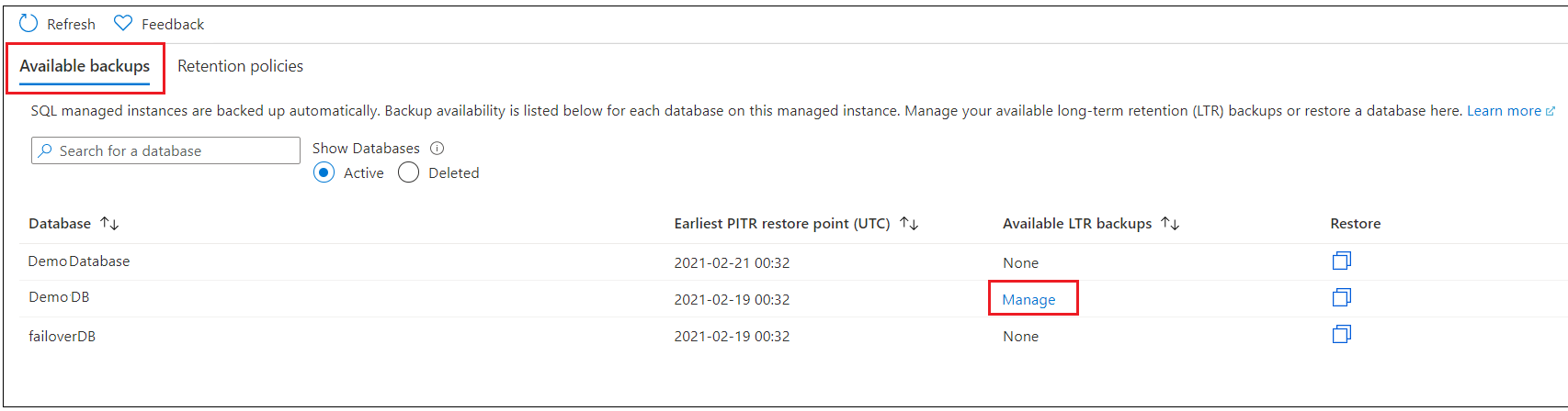 На портале Azure выберите управляемый экземпляр SQL, а затем выберите "Резервные копии". На вкладке Доступные архивы выберите базу данных, для которой нужно просмотреть доступные резервные копии. Выберите Управление.