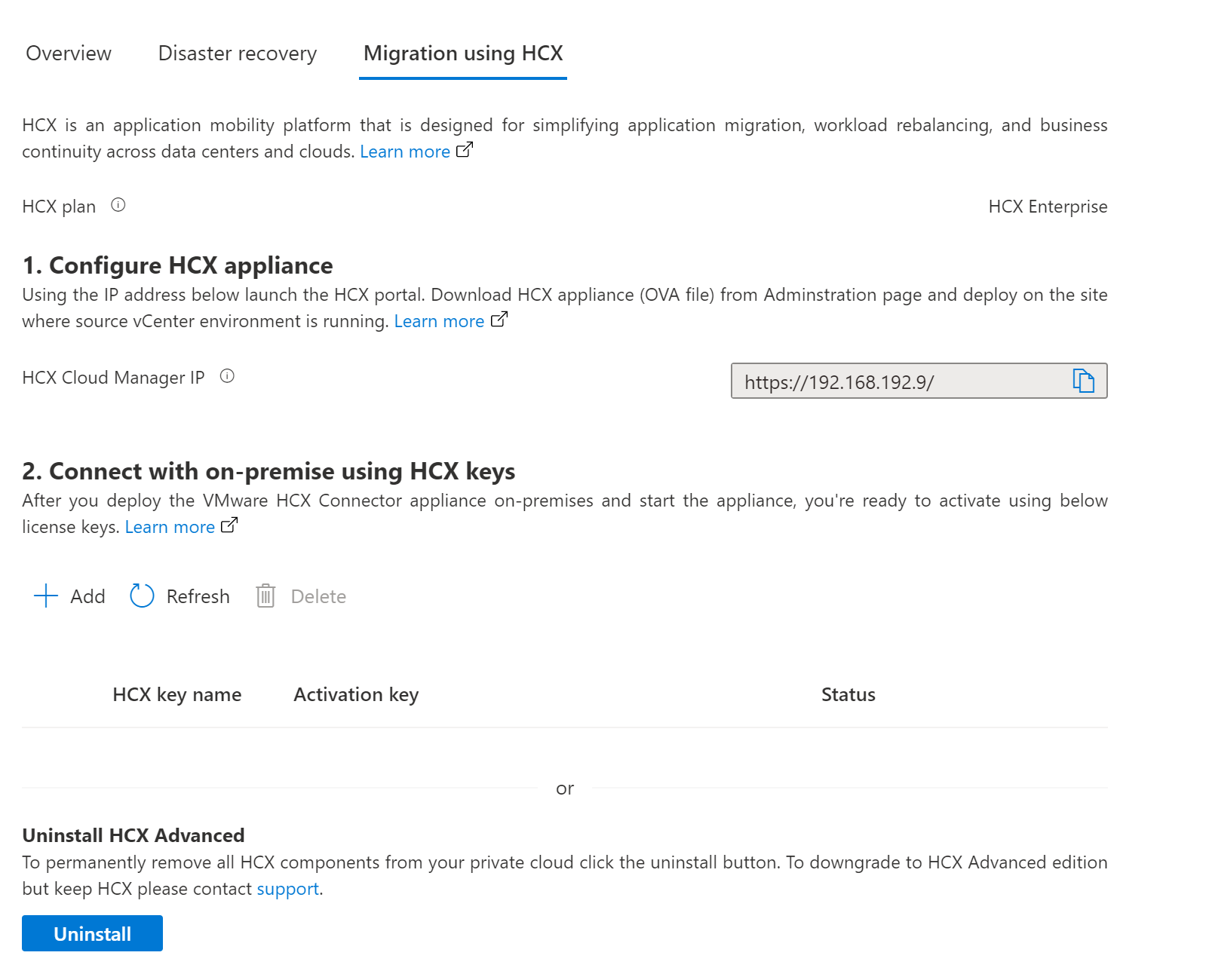 Выберите Начало работы для HCX Workload Mobility, затем нажмите Удалить.