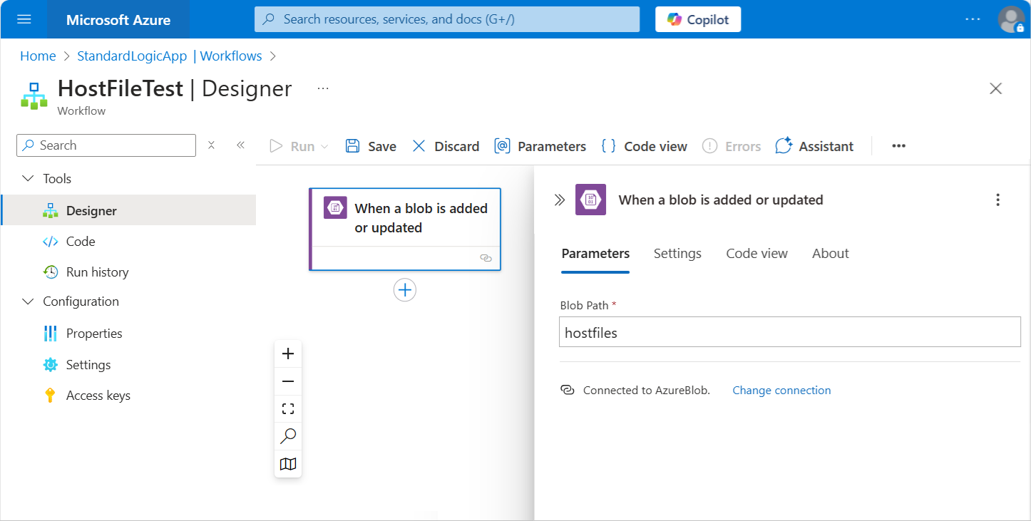 На портале Azure откройте в конструкторе ресурс и рабочий процесс вашего стандартного приложения логики.