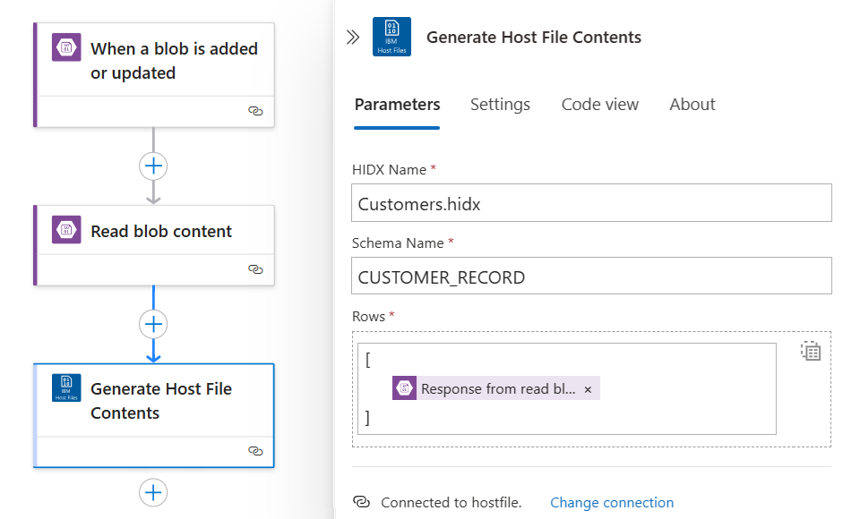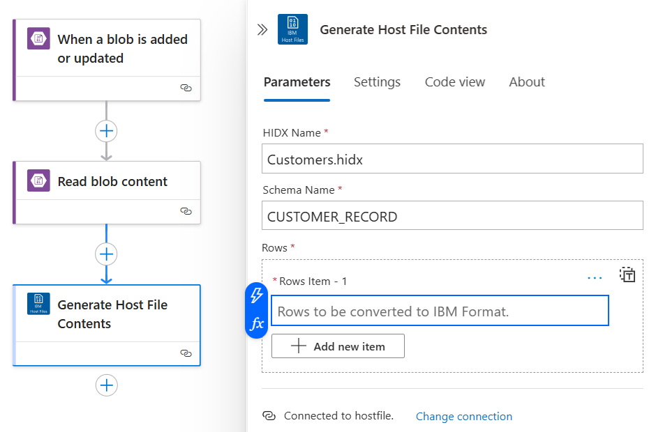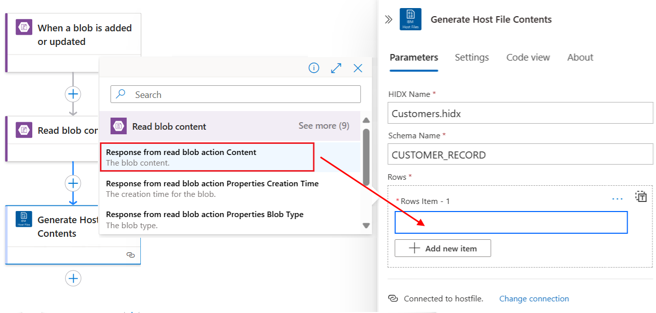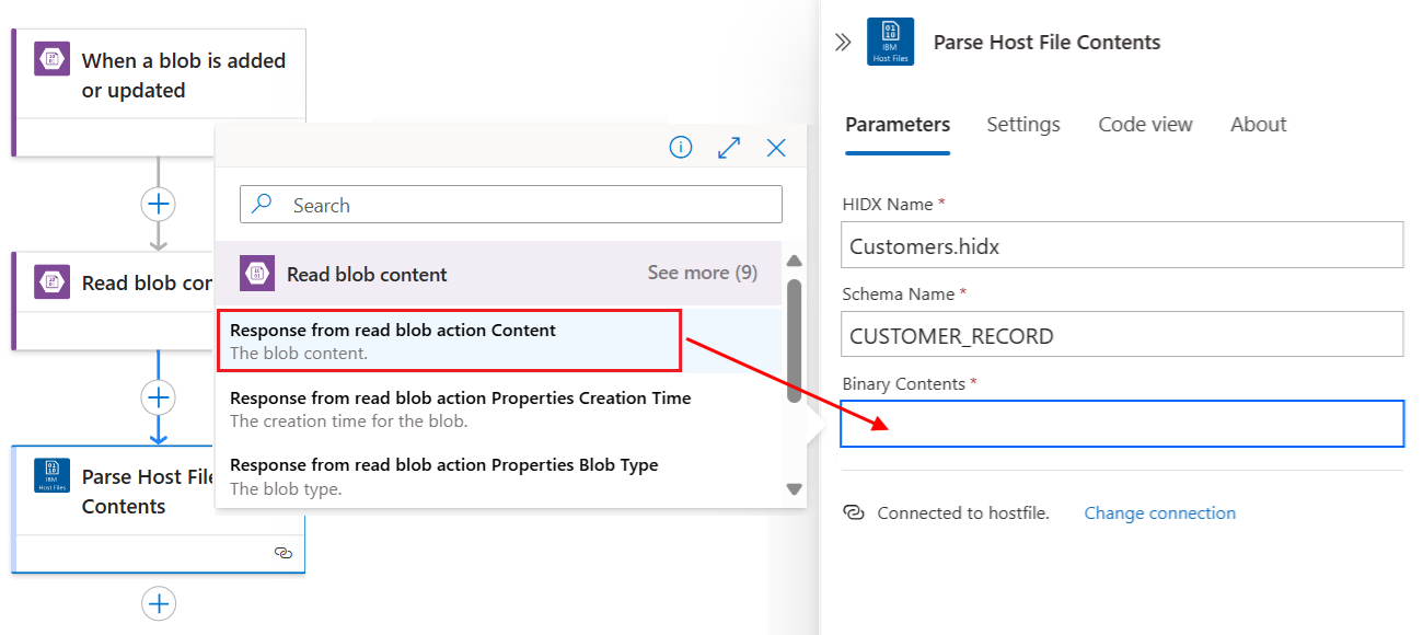 Добавьте встроенное действие соединителя IBM Host File с именем Parse Host File Contents , выполнив следующие общие действия.