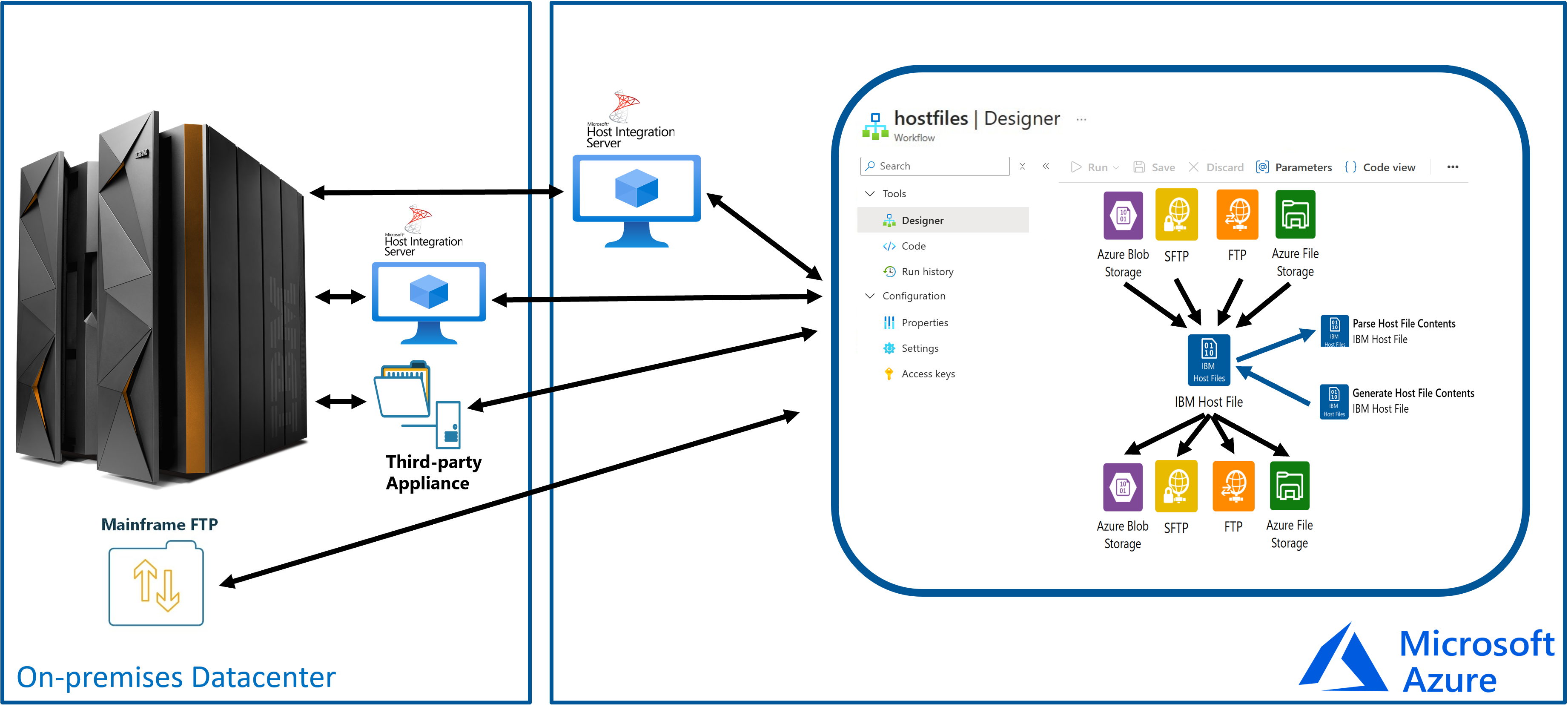 На следующей схеме показано, как соединитель IBM Host File в Azure Logic Apps взаимодействует с другими системами для чтения, разбора и генерации содержимого файла узла.