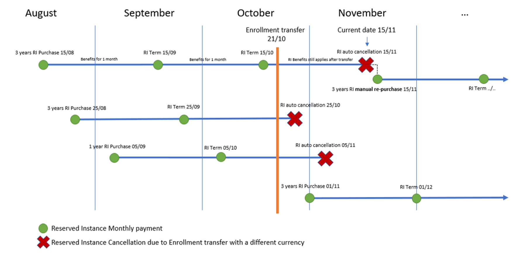 Передача регистрации или учетной записи между различными валютами влияет на покупки, связанные с ежемесячным резервированием. Следующее изображение иллюстрирует эффекты.