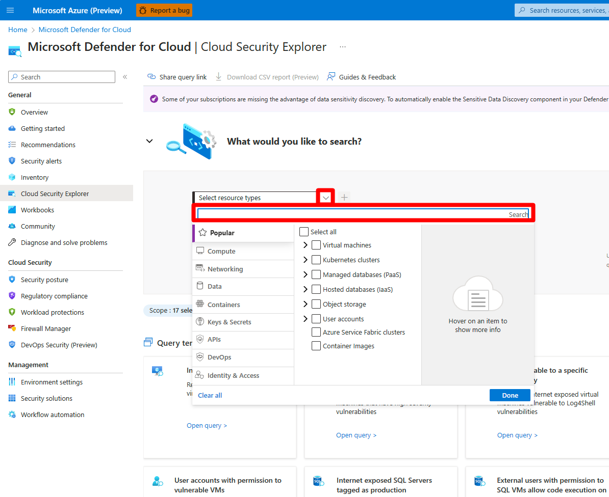 Если у вас включен только план 2 Defender для серверов P2 , вы можете использовать обозреватель облачной безопасности для запроса ключей и секретов, но для получения полной стоимости обозревателя необходимо включить CSPM Defender.