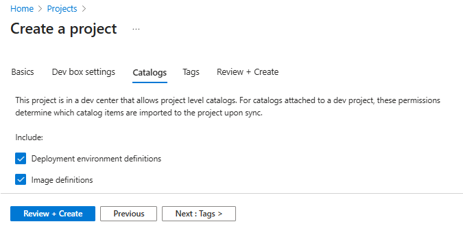 Настройка Значение Определения среды развертывания Выберите, чтобы включить Dev Box для синхронизации определений сред развертывания из каталога, подключенного к проекту. Определения изображений Выберите, чтобы включить возможность Dev Box синхронизировать определения образов из каталога, подключенного к проекту. (Необязательно) На вкладке Теги введите пару имя-значение для назначения.