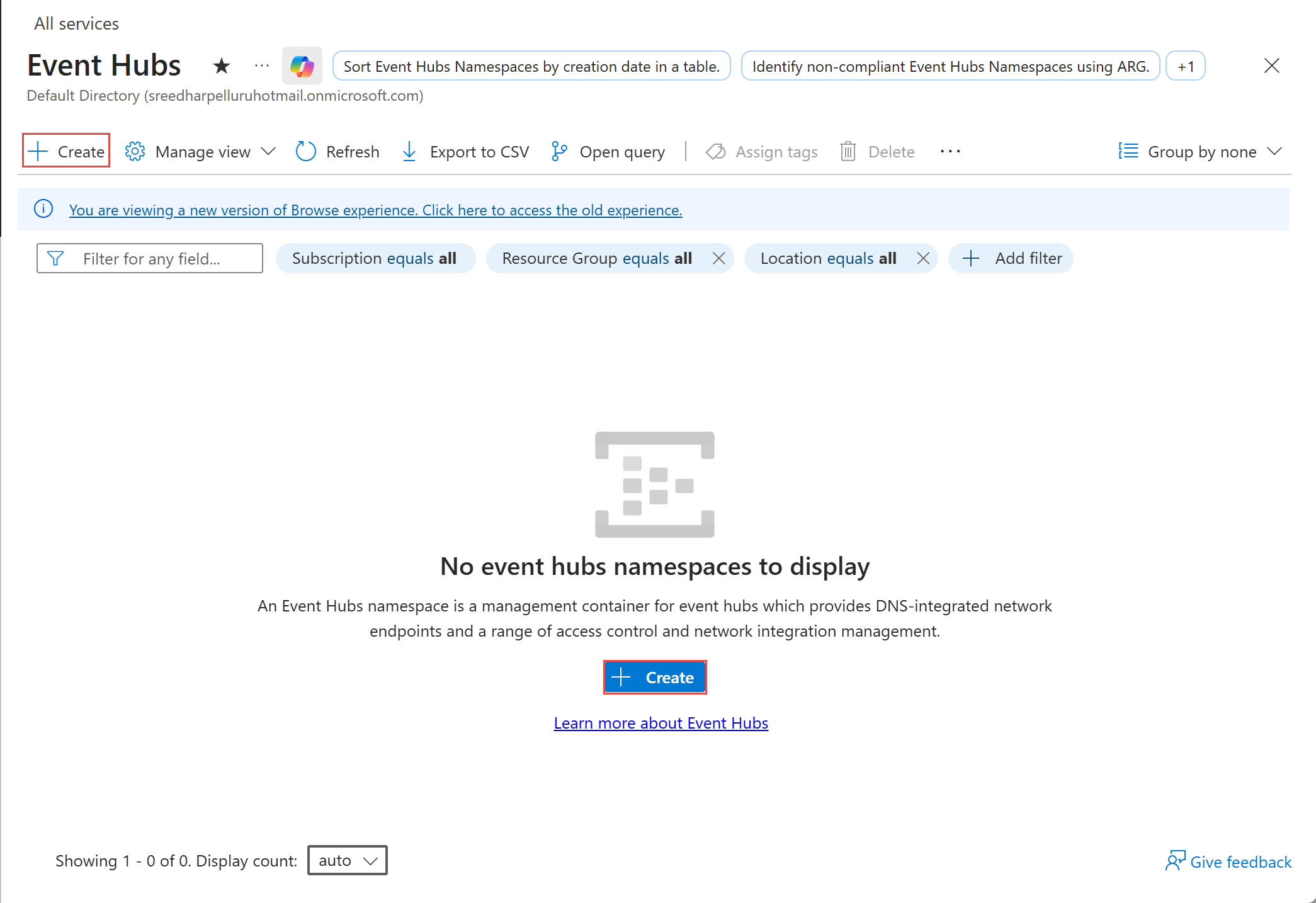 Убедитесь, что вы увидите страницу пространства имен Центров событий, аналогичную следующему примеру: