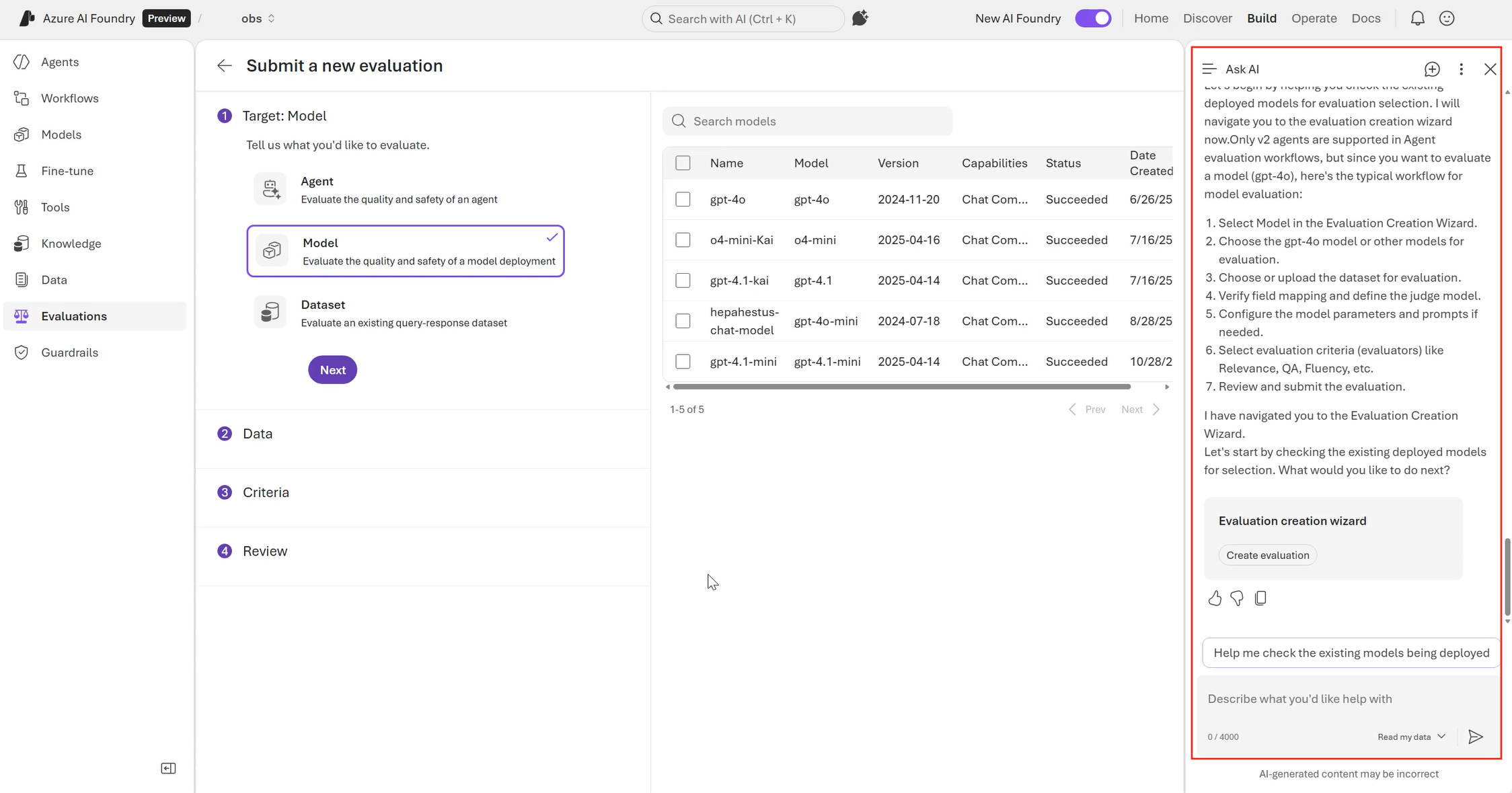 Используйте Спросите ИИ — встроенный помощник на портале Microsoft Foundry — для обнаружения устаревших или вышедших из употребления моделей, сравнения альтернатив и обновления развернутых моделей или агентов до более новых версий. Просмотрите рекомендации по обновлению, оцените новую модель, сравните производительность и обновите агент — все из панели чата Ask AI.