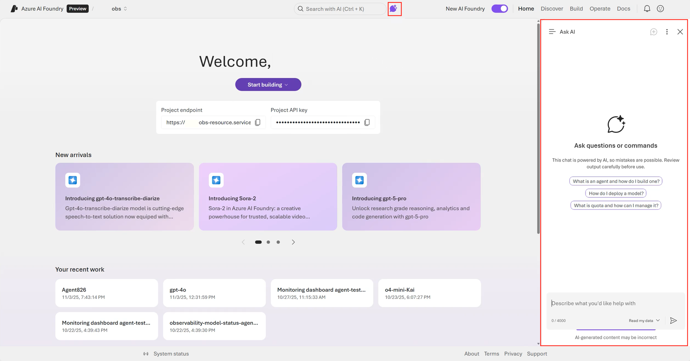 Вы можете начать чат с Ask AI с любой страницы на портале Foundry.