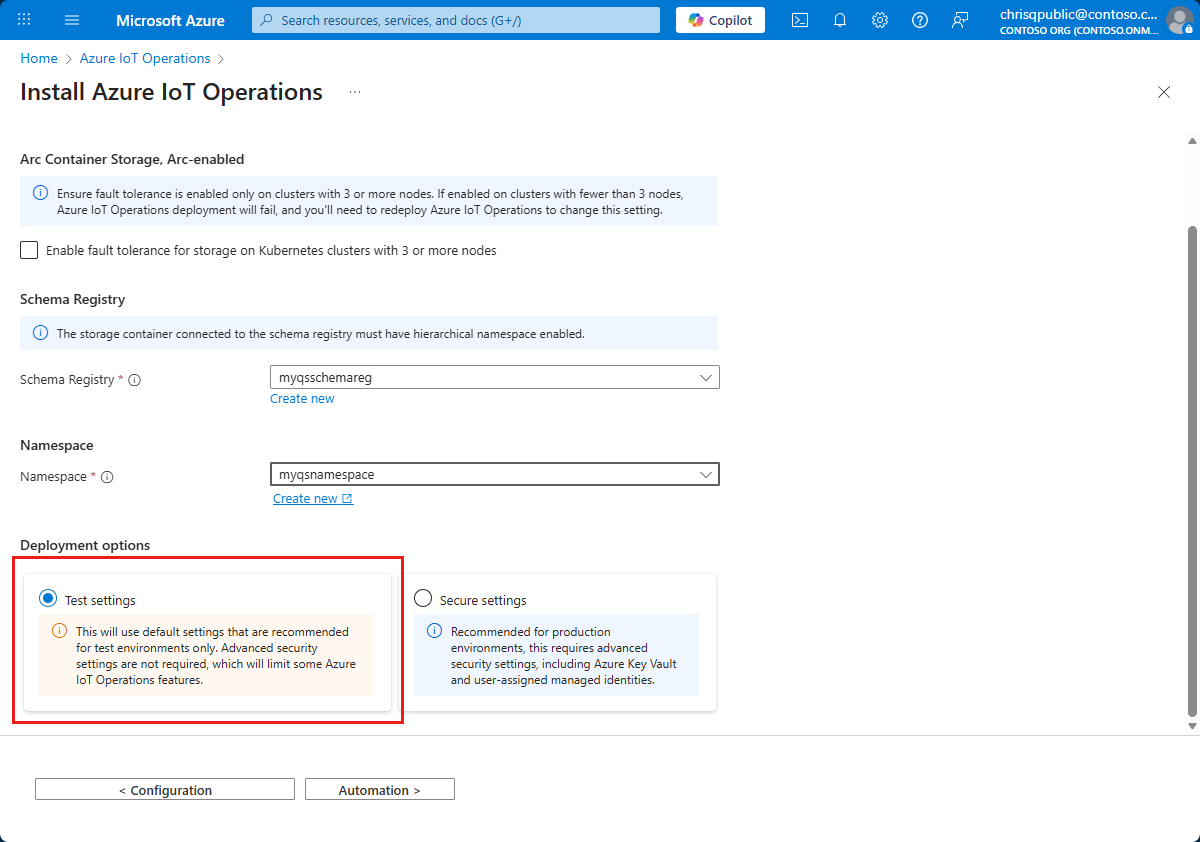 az extension add --upgrade --name azure-iot-opsСкопируйте и запустите указанную команду az iot ops schema registry create , чтобы создать реестр схем, используемый компонентами Операций Интернета вещей Azure. Если вы решили использовать существующий реестр схем, эта команда не отображается на вкладке автоматизации .