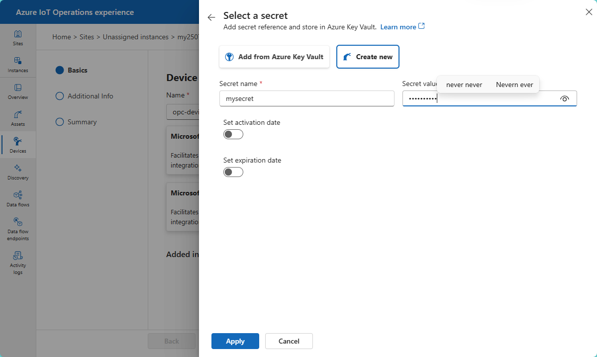 После завершения настройки действий по управлению секретами вы можете добавить секреты в Azure Key Vault и синхронизировать их с кластером Kubernetes для использования в конечных точках входящего устройства или конечных точках потока данных с помощью веб-интерфейса интерфейса операций . Секреты обычно являются именами пользователей, паролями, сертификатами или закрытыми ключами, необходимыми для проверки подлинности во внешних системах.