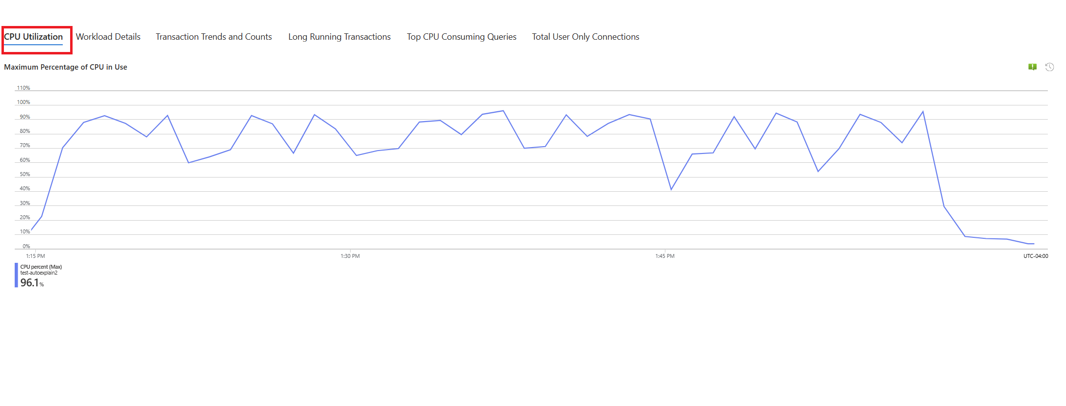 auto_explainрасширение должно записывать запись в журналах. В меню ресурсов в разделе "Мониторинг " выберите "Журналы".Выберите диапазон времени, в котором обнаружена загрузка ЦП 90 %.