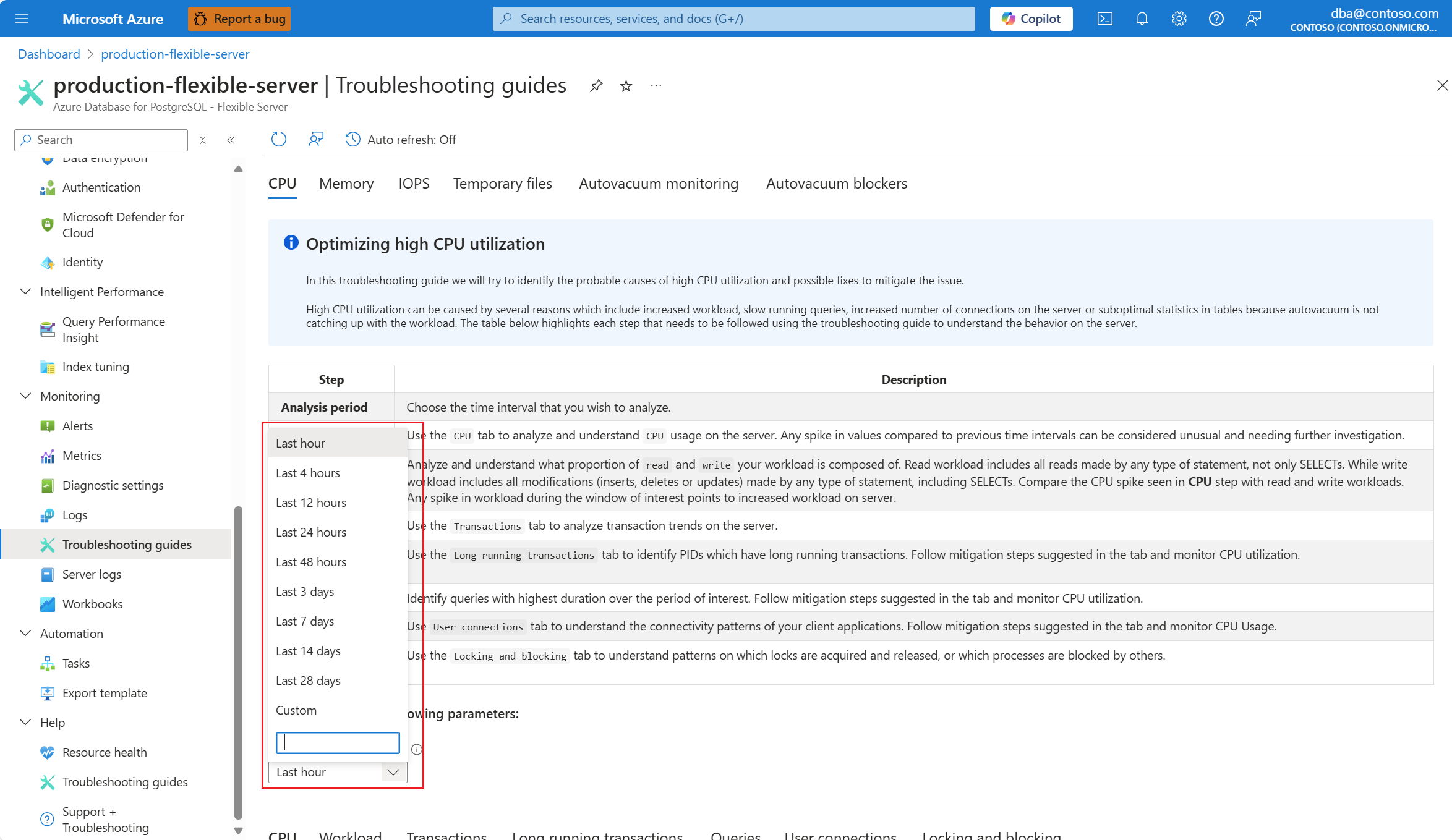 Как только вы оповещены сценарием ЦП, в меню ресурсов затронутого экземпляра гибкого сервера Базы данных Azure для PostgreSQL в разделе "Мониторинг " выберите руководства по устранению неполадок.