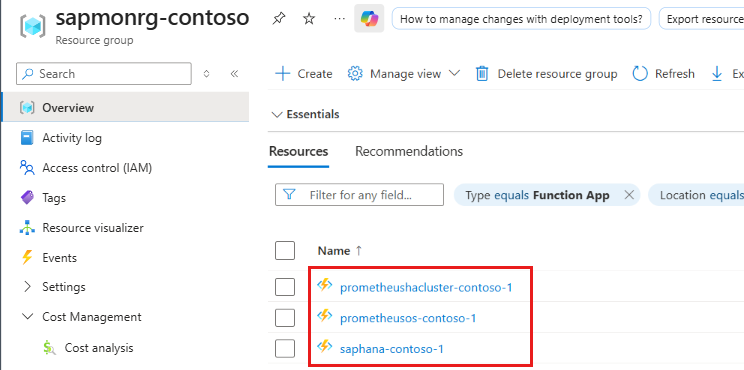 Теперь откройте управляемую группу ресурсов для ресурса azure Monitor для решений SAP. Имя управляемой группы ресурсов можно найти на странице обзора ресурса azure Monitor для решений SAP.
