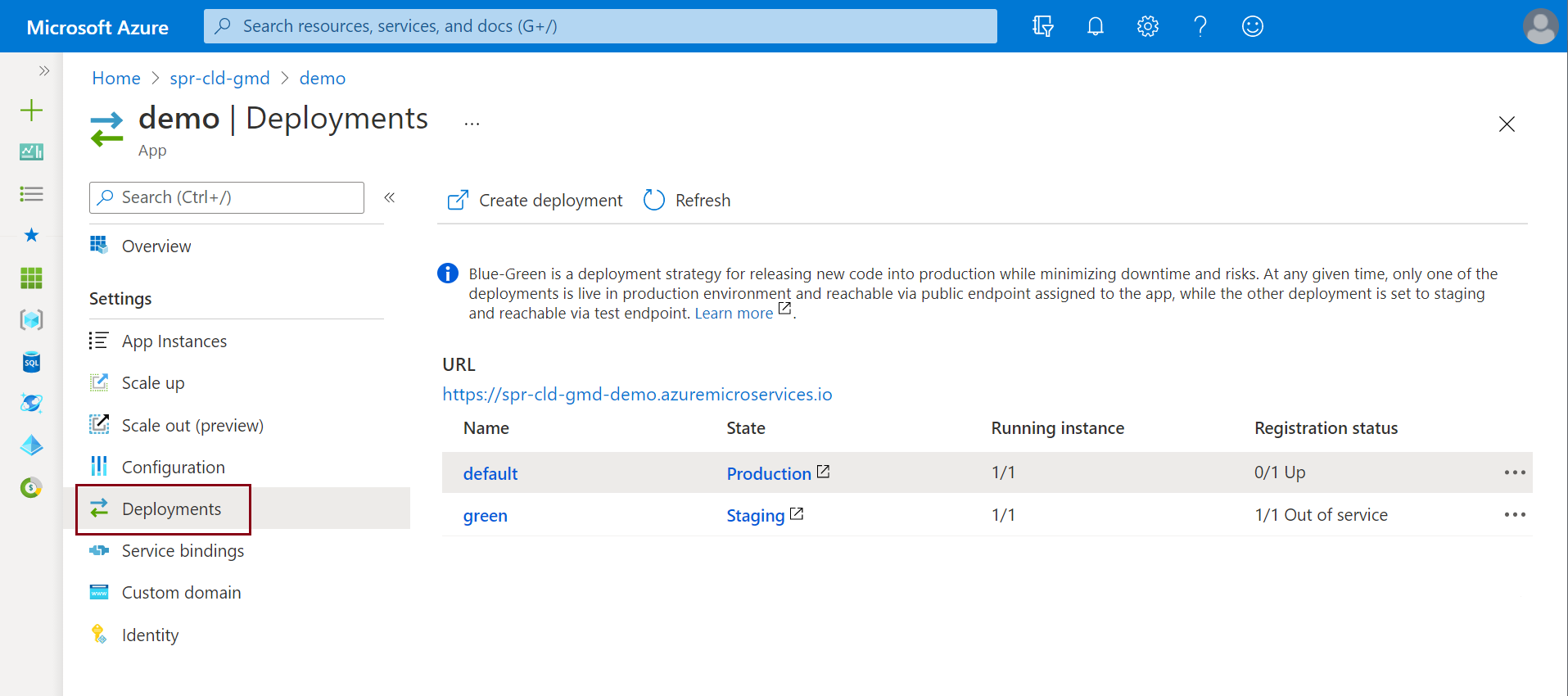 az spring app deploy \ --resource-group <resource-group-name> \ --service <Azure-Spring-Apps-instance-name> \ --name demo \ --artifact-path target\hellospring-0.0.1-SNAPSHOT.jarИзмените код для стейджингового развертывания.