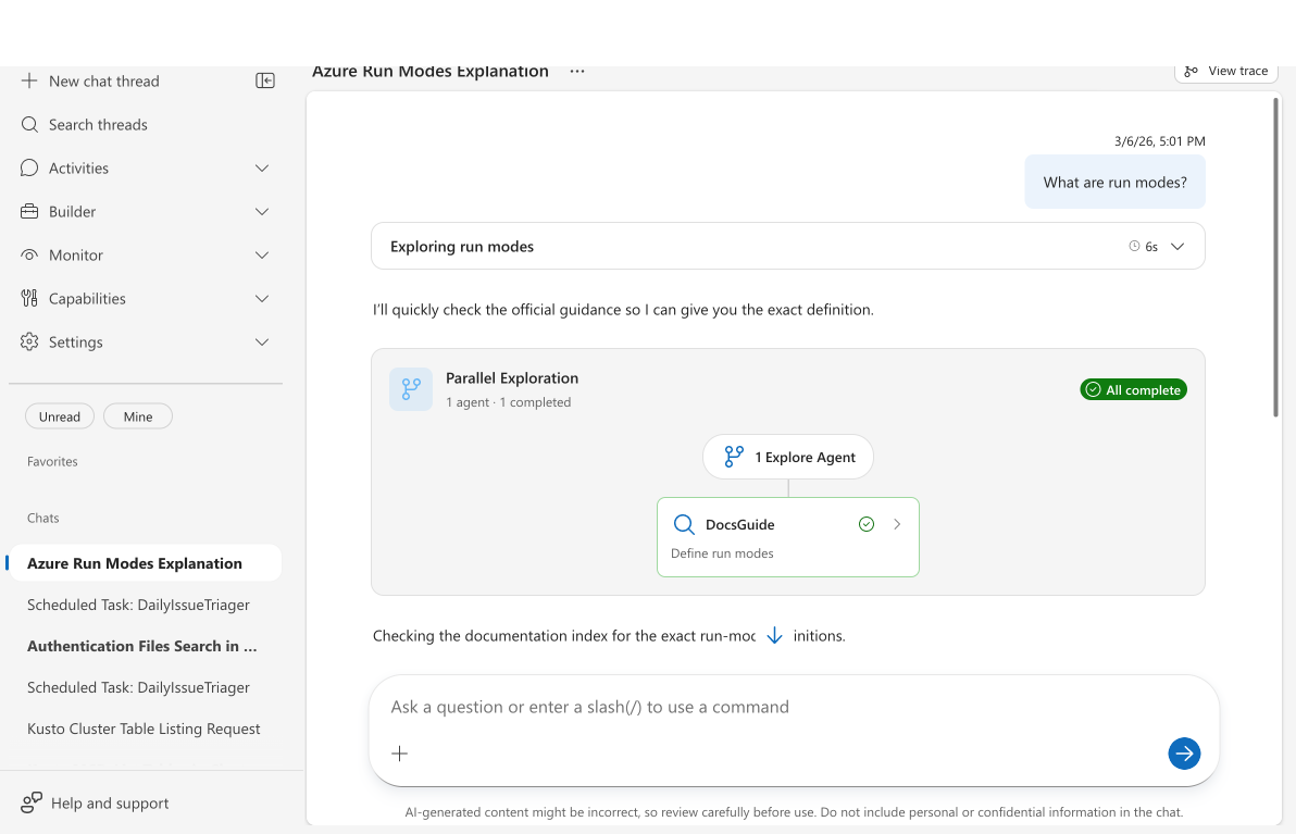 Попробуйте задать вопрос о концепции агента Azure SRE, чтобы узнать, как отвечает DocsGuide.