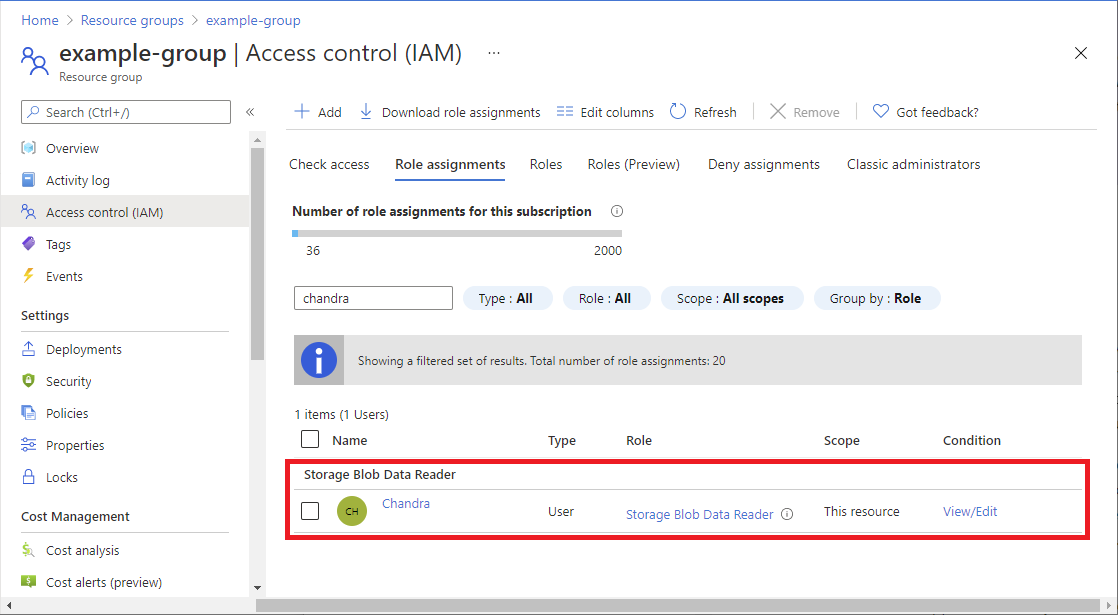 Повторите предыдущие действия, чтобы назначить роль читателя пользователю, созданному ранее в области группы ресурсов.