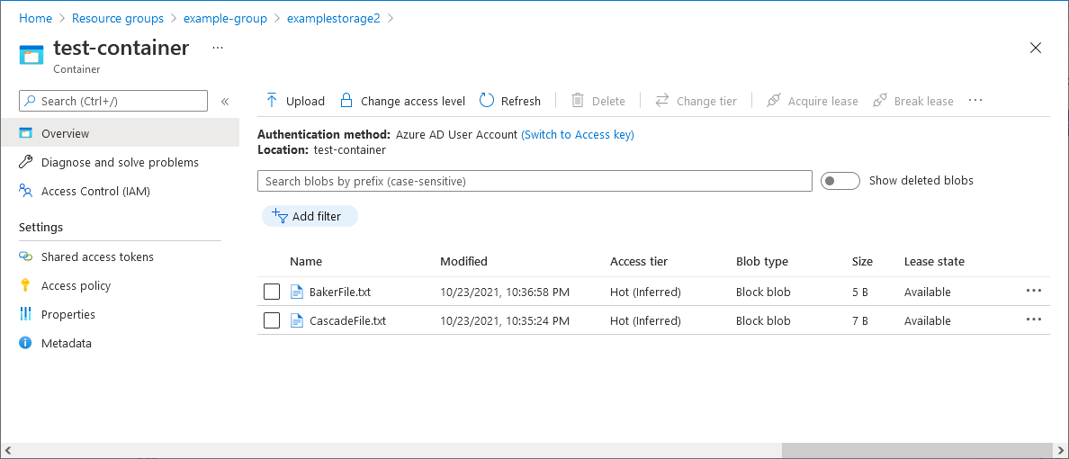 В контейнере выберите Загрузить, чтобы открыть панель загрузки blob.