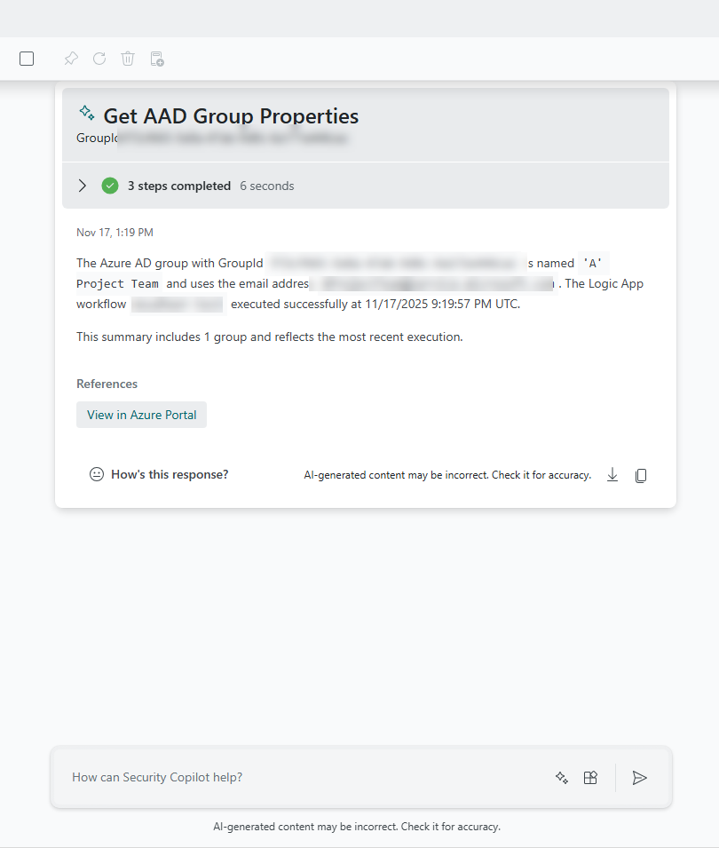 В этом кратком руководстве показано, как активировать рабочий процесс приложения логики с помощью Security Copilot. Вы создаете приложение логики с триггером HTTP-запроса, который принимает один GroupId аргумент в тексте запроса JSON и использует встроенный соединитель AAD для перечисления свойств этой группы.