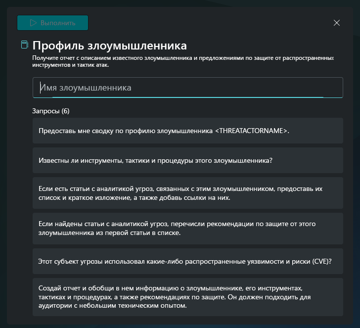 Модуль командной строки профиля субъекта угроз — это быстрый способ получить сводку о конкретном субъекте угроз. В сборнике запросов будут искаться все существующие статьи об аналитике угроз об субъекте, включая известные инструменты, тактики и процедуры (TTP) и индикаторы, включая предложения по исправлению. Затем он суммирует результаты в отчет для менее технических читателей.