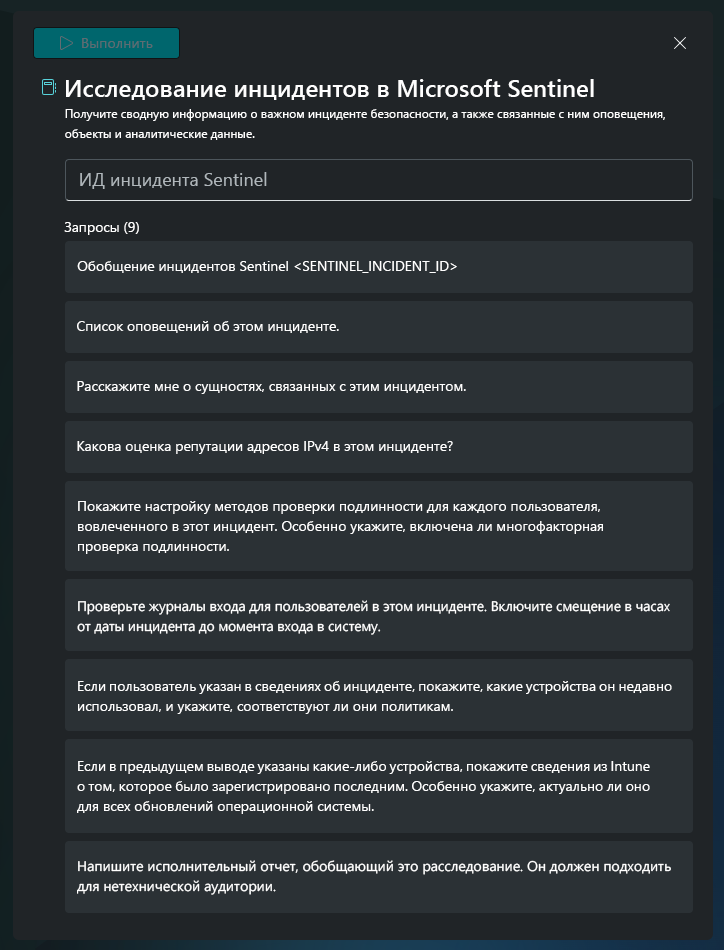 Вы можете запустить сборник запросов на исследование инцидентов, указав номер инцидента в Microsoft Sentinel или Microsoft Defender XDR подключаемом модуле. Используйте соответствующий модуль командной строки для подключаемого модуля, который вы хотите использовать. Сборники подсказок по расследованию инцидентов содержат несколько подсказок для создания исполнительного отчета для нетехнической аудитории, в котором приводится сводка исследования. Каждый запрос основан на предыдущем запросе.