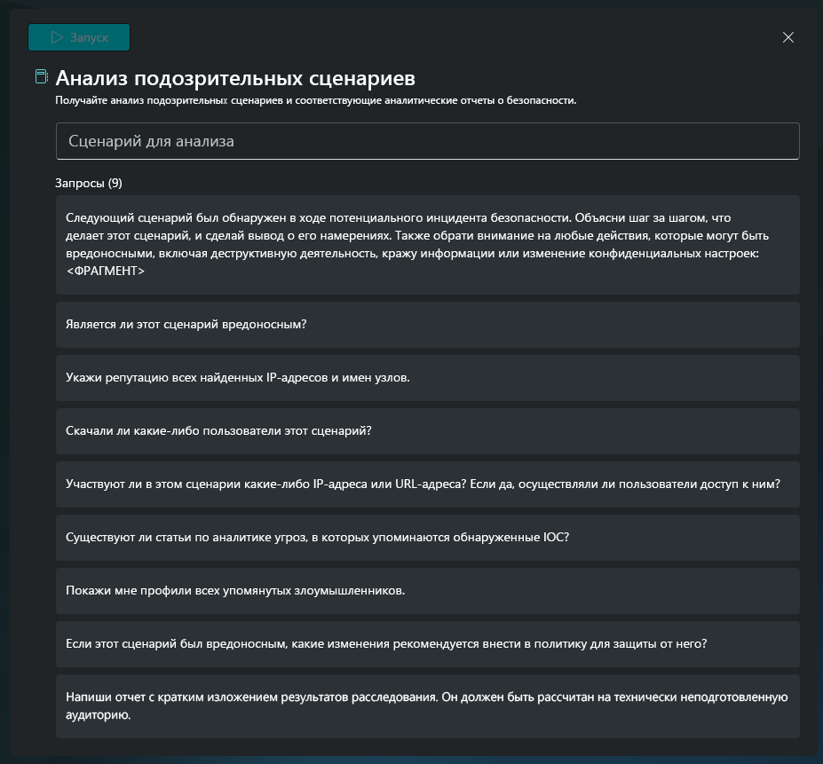 Security Copilot поставляется с предварительно созданными модулями командной строки— серией запросов, которые были собраны для выполнения конкретных задач, связанных с безопасностью. Они могут функционировать так же, как сборники схем безопасности — готовые к использованию рабочие процессы, которые могут служить шаблонами для автоматизации повторяющихся шагов, например в отношении реагирования на инциденты или расследования. Для каждого предварительно созданного модуля командной строки требуются определенные входные данные (например, фрагмент кода или имя субъекта угроз).