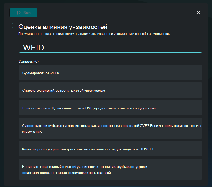 В Security Copilot нажмите кнопку Запросы на панели запросов и начните вводить несколько букв из книги подсказок с именем Проверить влияние статьи о внешней угрозе, пока в списке не появится книга запросов.