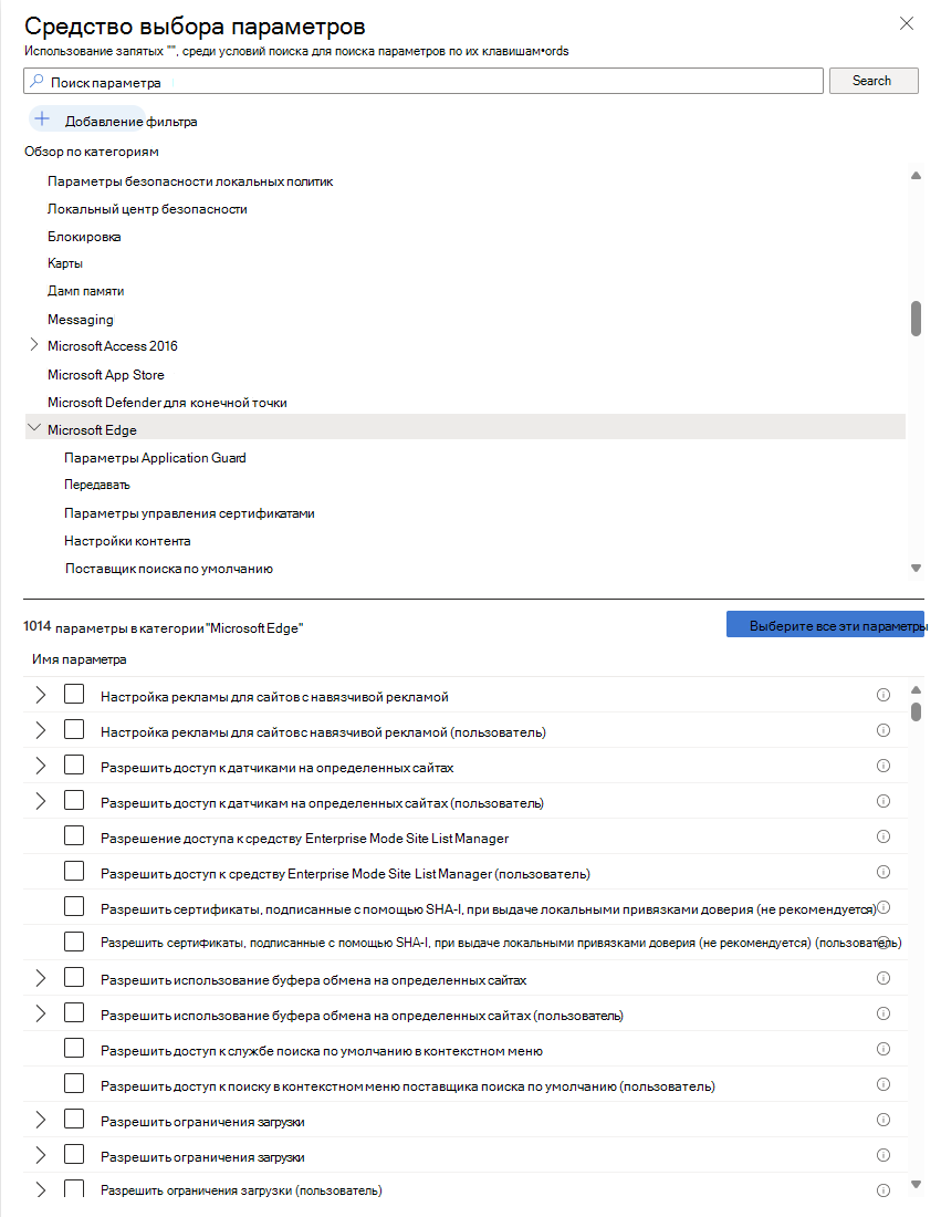 Создание политики для Microsoft Edge с помощью каталога параметров