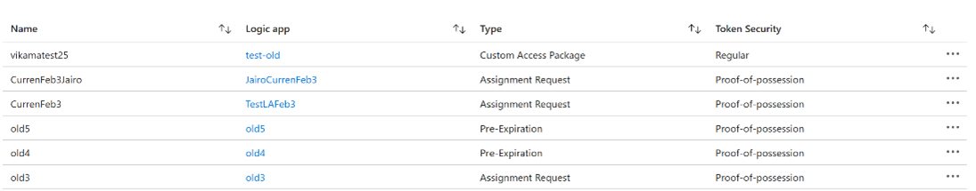 Наряду с именем Logic App, столбец 'Тип' определяет, было ли пользовательское расширение создано в новой модели аутентификации V2 (после 17 марта 2023 г.) или в исходной модели. Если настраиваемое расширение было создано в новой модели, столбец Type соответствует выбранному типу из модала конфигурации, который является "запрос на назначение" или "предварительный срок действия". Для старых пользовательских расширений в типе отображается "пользовательский пакет доступа".
