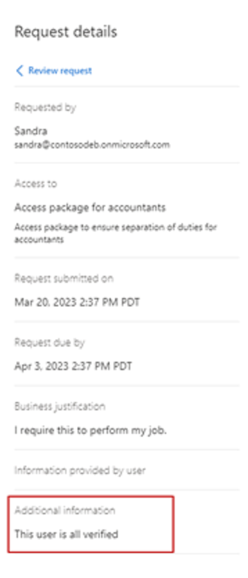 Утверждающий видит строку, указанную в полезных данных запроса резюме под customExtensionStageInstanceDetail, как это показано в полезных данных, находящихся в Настройка пользовательских расширений, которые приостанавливают процессы управления правами.