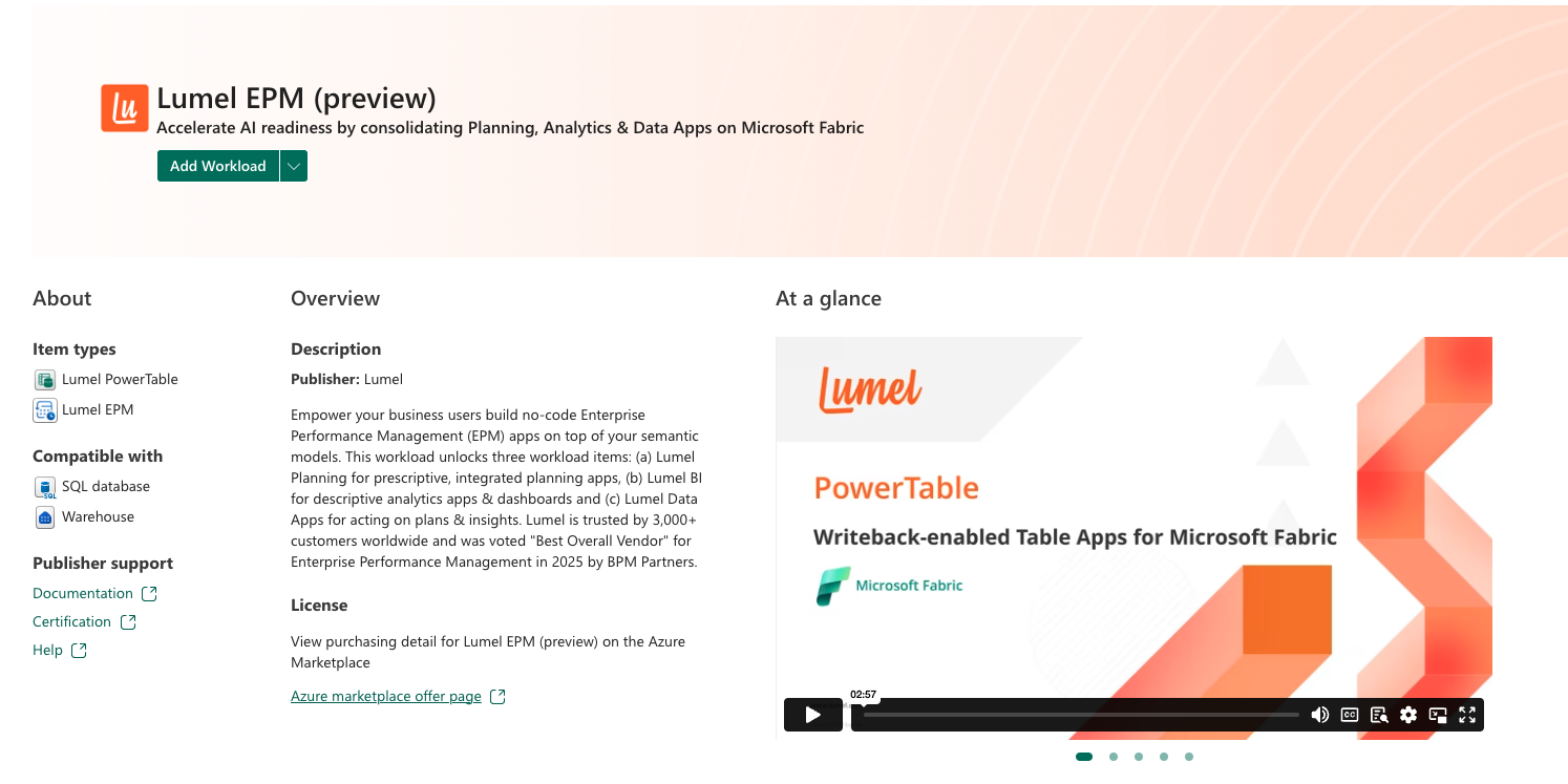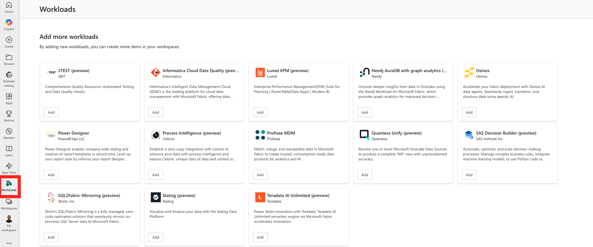 Администраторы Fabric имеют права управлять доступностью нагрузок, что делает их доступными для всего арендатора или в определенных емкостях. Эта расширяемость гарантирует, что Fabric остается гибкой и масштабируемой платформой, что позволяет организациям адаптировать среду рабочей нагрузки в соответствии с изменяющимися данными и бизнес-требованиями. Интеграция с платформой безопасности и управления Fabric упрощает развертывание и управление рабочими задачами. Каждое задание поставляется с пробной версией, чтобы пользователи могли быстро приступить к работе. Ниже перечислены доступные рабочие нагрузки: