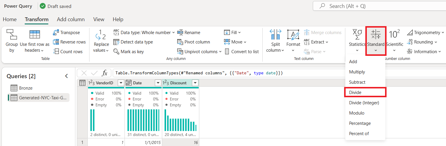 Выберите столбец скидки, а затем перейдите на вкладку преобразования. В разделе "Числовой столбец"выберите стандартные числовые преобразования из подменю и выберите "Разделить".