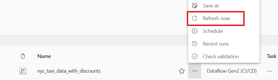 (Необязательно) На странице рабочей области можно переименовать поток данных, выбрав многоточие справа от имени потока данных, которое отображается после выбора строки и выбора параметров. В этом примере мы переименуем его в nyc_taxi_with_discounts.