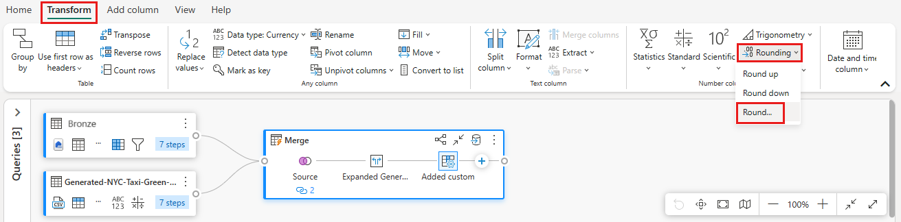 Выберите только что созданный столбец TotalAfterDiscount и перейдите на вкладку "Преобразование " в верхней части окна редактора. В группе столбец "Число" выберите раскрывающийся список "Округление", затем нажмите "Округлить...".
