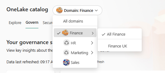 Если ваша организация определяет домены, можно использовать селектор домена каталога OneLake для выбора определенного домена или поддомена. Это действие определяет аналитические сведения и рекомендуемые действия для элементов, находящихся в выбранном домене.