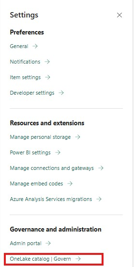 Вы также можете получить доступ к вкладке "Управление" из значка настроек, выбрав каталог OneLake | Управление по ссылке.