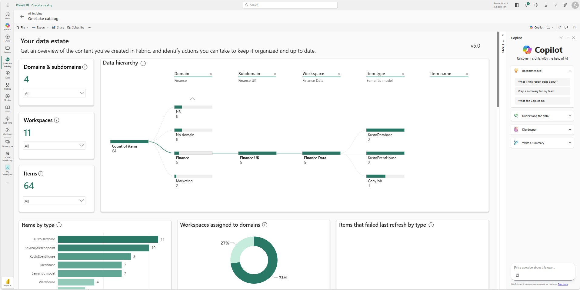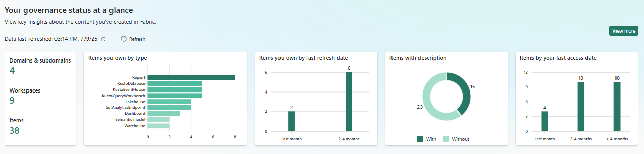 Эти аналитические сведения используют данные из последнего успешного обновления отчета об управлении каталогом OneLake. Данные обновляются автоматически при каждом открытии вкладки "Управление". Нажмите кнопку "Обновить", чтобы убедиться, что у вас есть последние данные.