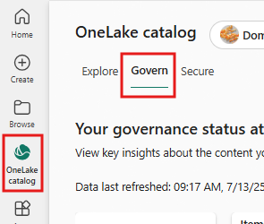 Чтобы открыть вкладку "Управление", выберите значок каталога OneLake в области навигации Fabric, а затем выберите "Управление".