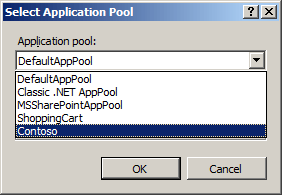 - В диалоговом окне Выбор пула приложений выберите пул приложений в раскрывающемся списке Пул приложений: нажмите кнопку ОК, а затем снова нажмите кнопку ОК .