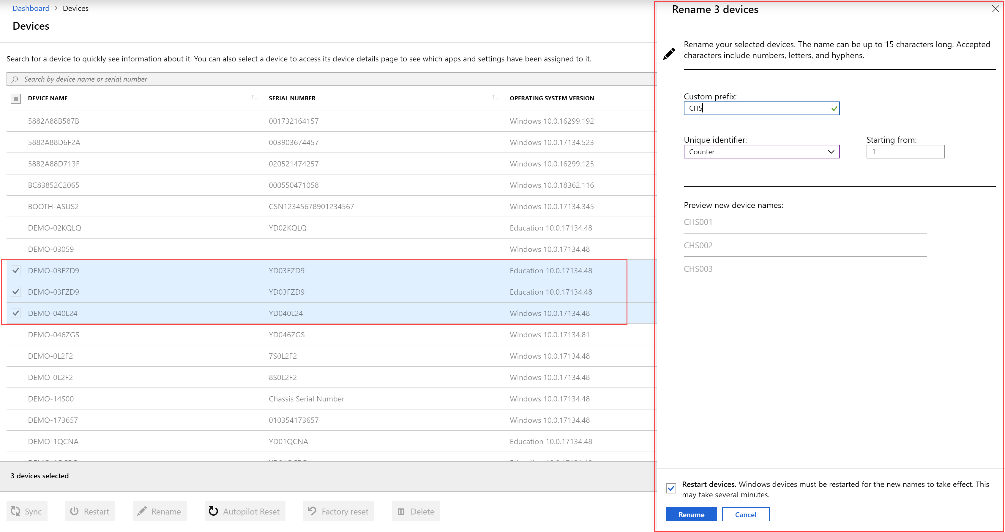 - Переименовать. Присвойте устройству новое имя. Новое имя обновляется в Intune и локально на устройстве. Чтобы новое имя вступило в силу, необходимо перезапустить устройство с Windows.