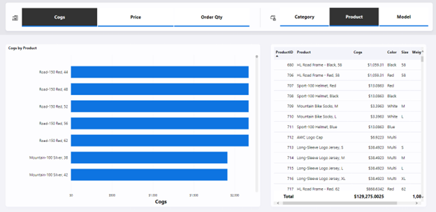 В следующем примере средство чтения отчетов может динамически обновлять линейчатую диаграмму и таблицу, выбрав поле в горизонтальных срезах над визуальными элементами. В настоящее время столбчатая диаграмма и таблица измеряют COGS и анализируются по продуктам на основе выбора читателя в срезах.