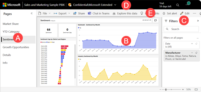 Е. Панель действий содержит ссылки на многочисленные действия, которые можно предпринять в этом отчете. Для некоторых действий требуются дополнительные разрешения. Например, на основе ваших разрешений вы можете редактировать, подписываться и предоставлять общий доступ к отчету. Все пользователи могут добавлять комментарий, просматривать закладку или создавать автоматические аналитические сведения. Выберите дополнительные параметры (...), чтобы просмотреть полный список действий отчета.
