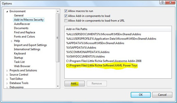 Первое использование При первом использовании XAML Power Toys измените и сохраните стандартные значения параметров элементов управления. Если не сделать этого и воспользоваться функцией, использующей эти значения, будут созданы и сохранены настройки по умолчанию, а также появится диалоговое окно, информирующее об этом. Редактирование и сохранение стандартных значений параметров элементов управления перед использованием XAML Power Toys позволит не только избежать постоянного появления этого диалогового окна, но и контролировать создание элементов управления с помощью XAML Power Toys. Значения параметров сохраняются в каталоге установки, поэтому они не теряются. Этот файл не заменяется при повторной установке и при удалении с помощью панели управления. Кроме того, можно легко создать резервную копию этих параметров. Безопасность макросов надстройки Чтобы приложение Visual Studio могло обнаружить средство XAML Power Toys, файл XAMLPowerToys.Addin должен находиться в пути, указанном в диалоговом окне ниже. Данный дополнительный этап установки объясняется в видеоролике, посвященном установке и настройке.