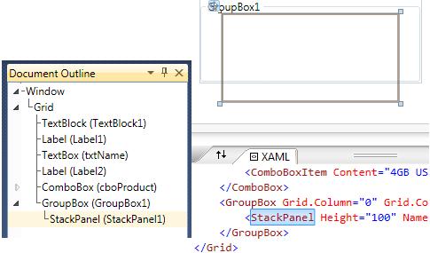 После создания элемента StackPanel поверхность разработки будет выглядеть, как показано на рис. 22 ниже. Обратите внимание, что в редакторе XAML и структуре документа элемент StackPanel является дочерним элементом GroupBox.